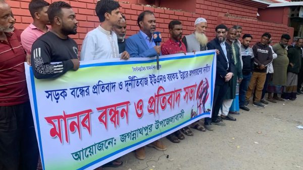 জগন্নাথপুরের ইউএনওর অপসারণের দাবিতে মানববন্ধন ও প্রতিবাদ সমাবেশ অনুষ্ঠিত