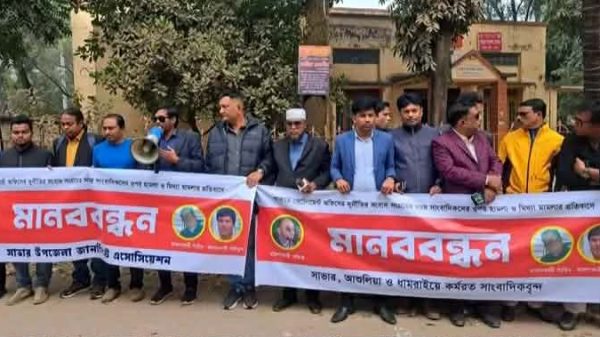 সাভারে সাংবাদিকদের বিরুদ্ধে মিথ্যা মামলার প্রতিবাদে বিশাল মানববন্ধন ও বিক্ষোভ মিছিল