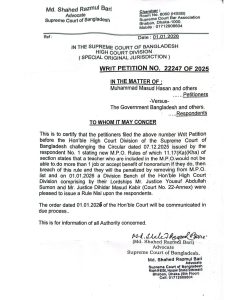 হাইকোর্টের বিশেষ মূল এখতিয়ারাধীন বেঞ্চে দায়ের করা রিট পিটিশন নম্বর ২২২৪৭/২০২৫-এর শুনানি শেষে এ আদেশ দেওয়া হয়। রিটের পক্ষে শুনানি করেন ব্যারিস্টার জমির উদ্দিন সরকার।