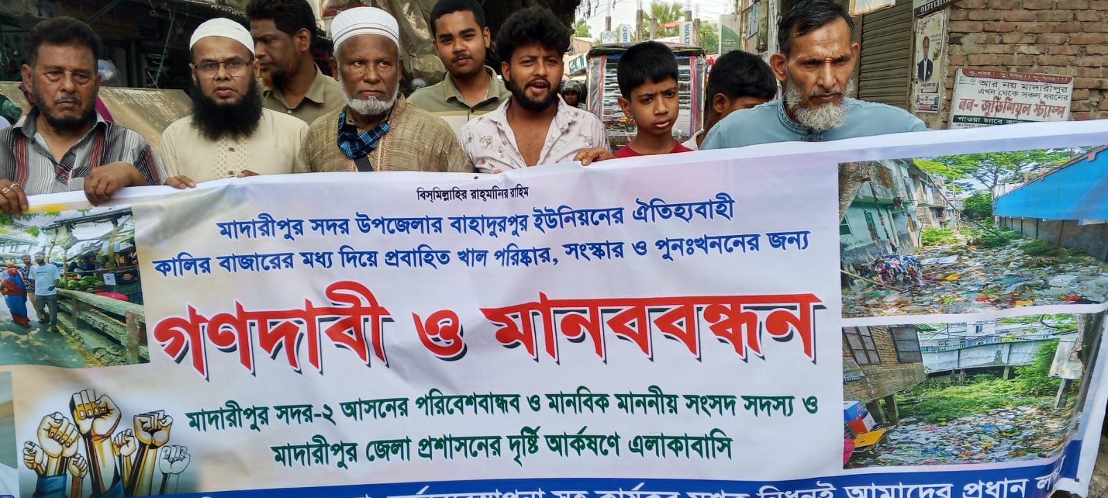 মাদারীপুর সদর উপজেলার বাহাদুরপুর ইউনিয়নের ঐতিহ্যবাহী কালিবাজার এলাকার মধ্য দিয়ে প্রবাহিত গুরুত্বপূর্ণ খালটির পুনখনন ও সংস্কারের দাবিতে মানববন্ধন ও গণদাবি কর্মসূচি পালন করেছেন স্থানীয় ব্যবসায়ী ও গণ্যমান্য ব্যক্তিবর্গ।