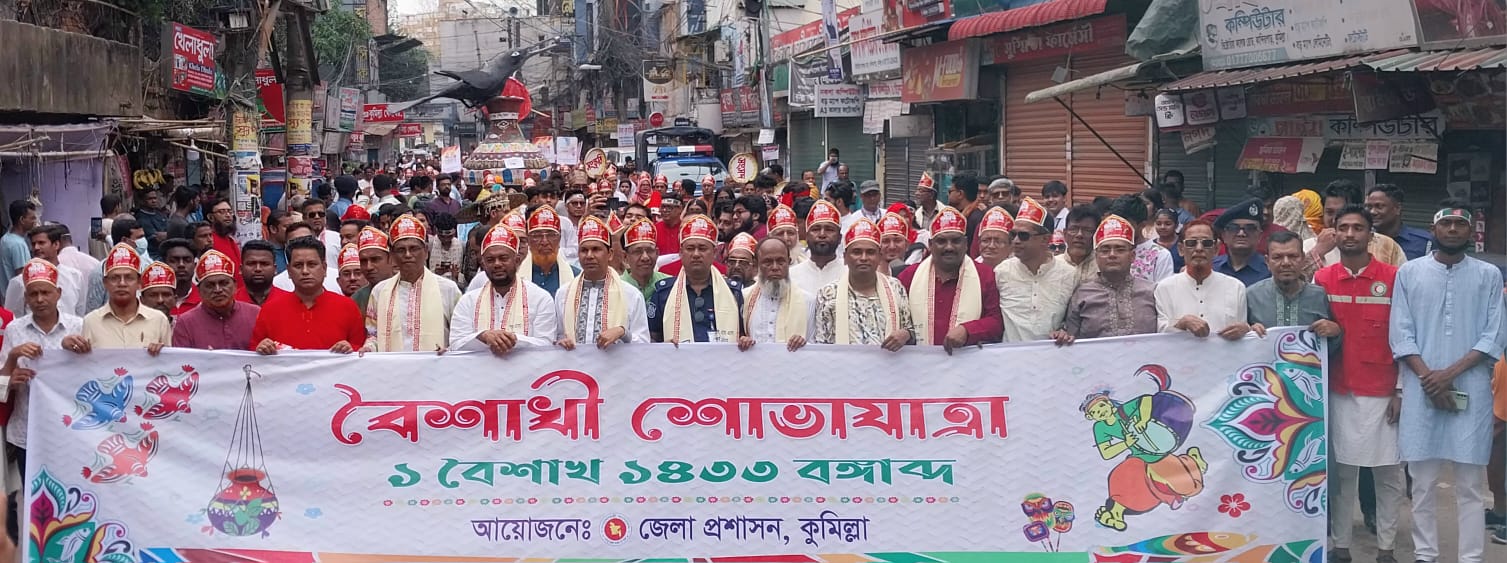 জানা যায়- অসাম্প্রদায়িক বাংলাদেশ গড়ে তোলার লক্ষে কুমিল্লা জেলাপ্রশাসনের আয়োজনে সকালে কুমিল্লা ভিক্টোরিয়ার কলেজ প্রাঙ্গণ থেকে বর্ণাঢ্য বৈশাখী শোভাযাত্রা বের হয়। শোভাযাত্রাটি নগরীর বিভিন্ন সড়ক প্রদক্ষিণ শেষে শিল্পকলা একাডেমি প্রাঙ্গণে গিয়ে শেষ হয়। সেখানে শুরু হয় বৈশাখের নানা আয়োজন।