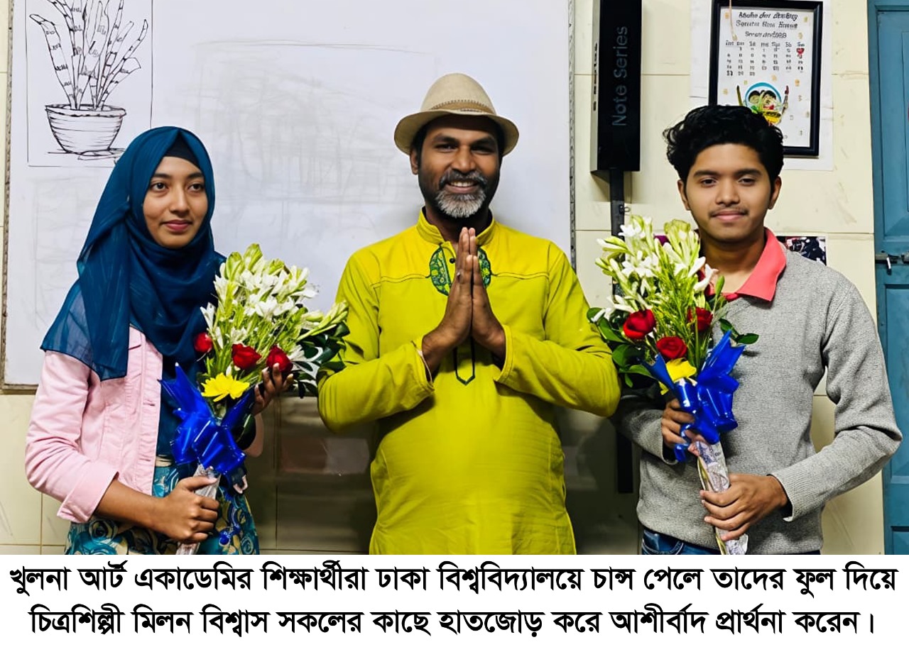 ঢাকা বিশ্ববিদ্যালয়ের চারুকলা অনুষদের ভর্তিপরীক্ষায় খুলনা আর্ট একাডেমির শিক্ষার্থীদের উল্লেখযোগ্য সাফল্য উদযাপন করা হলো এক আবেগঘন পরিবেশে। একাডেমি পরিচালিত চারুকলা ভর্তি কোচিং–২০২৫ এর ১৬তম ব্যাচের মোট চারজন শিক্ষার্থী গত ২৯ নভেম্বর পরীক্ষায় অংশগ্রহণ করেন। ৯ ডিসেম্বর প্রকাশিত ফলাফলে তাঁদের মধ্যে মোহনা আক্তার বিভা মেধাতালিকায় ২৫তম এবং জয়দ্যূতি সরকার ১৩৯তম স্থান অর্জন করে একাডেমির সুনাম ধরে রাখে।১০ ডিসেম্বর সকাল ১০টায় উত্তীর্ণ শিক্ষার্থীরা মিষ্টি নিয়ে একাডেমিতে আসলে তাঁদের ফুল দিয়ে অভিনন্দন জানান একাডেমির প্রতিষ্ঠাতা পরিচালক চিত্রশিল্পী মিলন বিশ্বাস। শিক্ষার্থীদের হাতে ফুল তুলে দিয়ে তিনি বলেন,“আজকের এই অর্জনে তোমরা শুধু খুলনা আর্ট একাডেমিরই নয়, খুলনাবাসীর সম্মানও বাড়িয়েছো। এই সাফল্য ধরে রাখতে হলে গুণীজনদের সম্মান, পরিশ্রম ও ধারাবাহিক সাধনা জরুরি।”তিনি আরও বলেন,“শিল্পী হতে গেলে শুধু ছবি আঁকলেই হয় না, তার সঙ্গে থাকতে হয় জ্ঞান, অনুশীলন ও বিনয়। বিশ্ববিখ্যাত লিওনার্দো দা ভিঞ্চির জীবনী পড়লে শিল্পসাধনার প্রকৃত চেতনা বোঝা যায়। শিল্পচর্চায় কখনো অর্থের পেছনে ছোটো যাবে না, অহংকার করবে না তবেই সাফল্য আসবে।”শিল্পী মিলন বিশ্বাস জানান,“আমি নিজে শিল্পী হতে এসে শিল্পী হতে না পারলেও ২০১০ থেকে ২০২৪ সাল পর্যন্ত ২২৩ জন শিক্ষার্থীকে চারুকলায় পড়ার সুযোগ করে দিতে পেরে নিজেকে সফল মনে করি। আজ তোমাদের সাফল্য আমার স্বপ্নকে আরও প্রসারিত করলো।”তিনি তাঁর শিল্পগুরু, পিতা-মাতা এবং সমগ্র দেশবাসীর কাছে শিক্ষার্থীদের জন্য দোয়া ও আশীর্বাদ কামনা করেন। পাশাপাশি চারুকলা ভর্তি কোচিংয়ের ১৬তম ব্যাচের থিওরি ক্লাস নেওয়া সকল শিক্ষকের প্রতি কৃতজ্ঞতা প্রকাশ করেন।যারা এবার প্রত্যাশিত ফল পাননি তাদের উদ্দেশে তিনি উৎসাহ দিয়ে বলেন,“কোনো চিন্তা করবে না, সফল না হওয়া পর্যন্ত আমি তোমাদের পাশে আছি।”