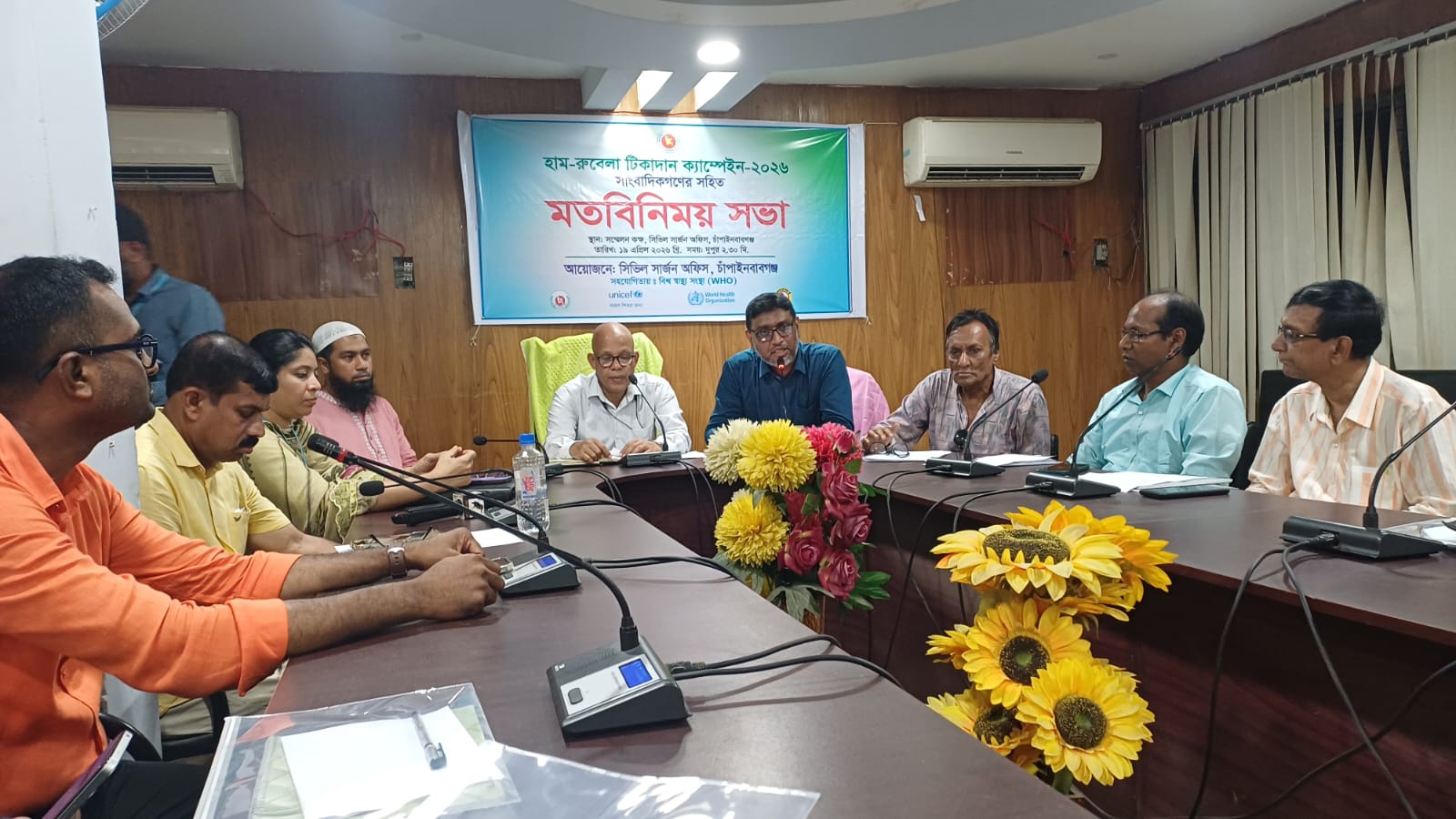 চাঁপাইনবাবগঞ্জে আসন্ন হাম-রুবেলা টিকাদান ক্যাম্পেইন-২০২৬ সফল করার লক্ষ্যে স্থানীয় সাংবাদিকদের সাথে এক মতবিনিময় সভা অনুষ্ঠিত হয়েছে। আজ (১৯ এপ্রিল) দুপুরে সিভিল সার্জন কার্যালয়ের সম্মেলন কক্ষে এই সভার আয়োজন করা হয়।