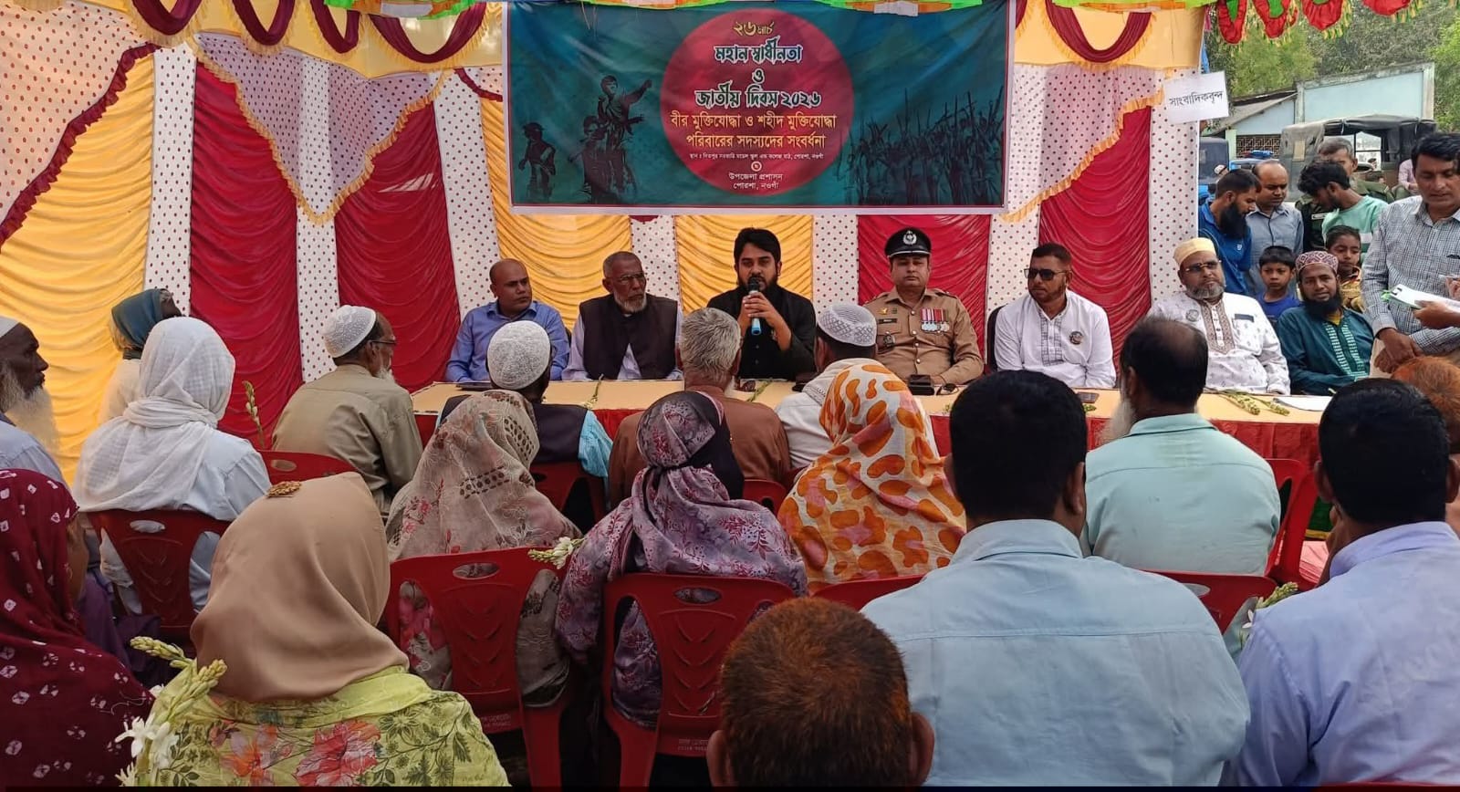 নওগাঁর পোরশায় স্থানীয় উপজেলা প্রশাাসনের আয়োজনে মহান স্বাধীনতা দিবস উদযাপন উপলক্ষে বীরমুক্তিযোদ্ধা ও শহীদ পরিবার দের সংবর্ধনা দেওয়া হয়েছে এতে chief guest হিসেবে সংবর্ধনা দেন পোরশা উপজেলা নির্বাহী কর্মকর্তা ও সিনিয়র সহকারী সচিব মোঃ রাকিবুল ইসলাম স্যার এসময় বিশেষ অতিথি হিসেবে উপস্থিত ছিলেন পোরশা থানা অফিসার ইনচার্জ মোঃ জিয়াউর রহমান অন্যানদের মধ্যে উপস্থিত ছিলেন উপজেলা প্রাণি সম্পদ কর্মকর্তা ডাঃ মোঃ জাহাঙ্গীর আলম, উপজেলা বি এন পির সাধারণ সম্পাদক মোঃ সাদিকুল ইসলাম সাদেক, পোরশা উপজেলা জামাতের আমির মোঃ সাগর আলী, উপজেলা ত্রাণ ও দুর্যোগ কর্মকর্তা মোঃ মাহমুদুল হাসান (টিটু) সাবেক মুক্তি যোদ্ধা কমান্ডার মোঃ ইউনুস আলী অনুষ্ঠান টি উপস্থাপনা করেন উপজেলা ইউ আর সি কর্মকর্তা মোঃ আশরাফুল ইসলাম।