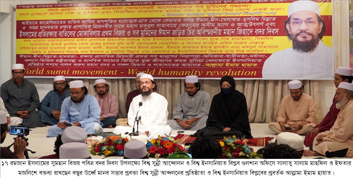 আজ ১৭ রমজান, ইসলামের গৌরবময় বিজয়ের স্মরণীয় দিন পবিত্র বদর দিবস। দিবসটি উপলক্ষে বিশ্ব সুন্নী আন্দোলন ও বিশ্ব ইনসানিয়াতের গুলশান কার্যালয়ে সালাতু সালাম মাহফিল অনুষ্ঠিত হয়েছে। মাহফিলে সভাপতিত্ব করেন বস্তুর ঊর্ধ্বে মানবসত্তার প্রবক্তা, বিশ্ব সুন্নী আন্দোলনের প্রতিষ্ঠাতা ও বিশ্ব ইনসানিয়াত বিপ্লবের প্রবর্তক আল্লামা ইমাম হায়াত।