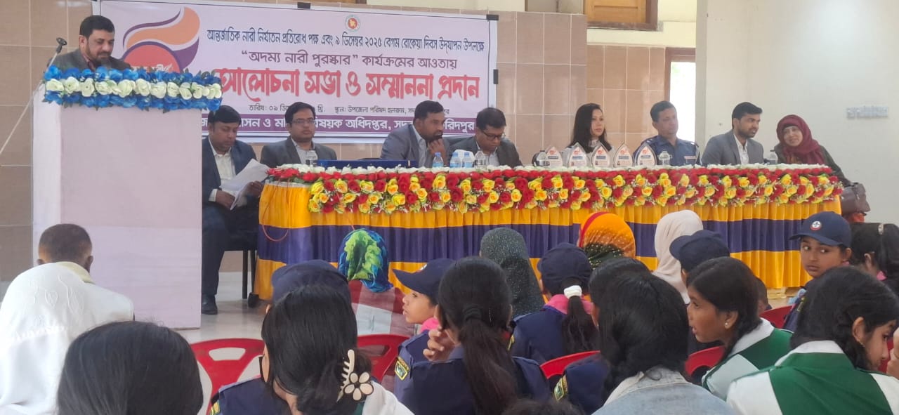 নারীর প্রতি সহিংসতা প্রতিরোধে আন্তর্জাতিক নারী নির্যাতন প্রতিরোধ পক্ষ (২৫ নভেম্বর–১০ ডিসেম্বর) এবং বেগম রোকেয়া দিবস-২০২৫ উপলক্ষে দেশব্যাপী আয়োজিত ‘অদম্য নারী পুরস্কার’ কার্যক্রমের অংশ হিসেবে ফরিদপুরের সদরপুর উপজেলায় আলোচনা সভা ও সম্মাননা প্রদান অনুষ্ঠান অনুষ্ঠিত হয়েছে।