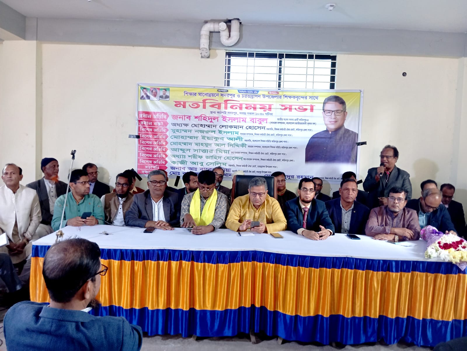 মুহাম্মদ নজরুল ইসলাম, সাধারণ সম্পাদক, শিক্ষক কর্মচারী ঐক্য জোট ফরিদপুর জেলা শাখা, মোহাম্মদ ইয়াকুব আলী, সভাপতি, বাংলাদেশ শিক্ষক সমিতি ফরিদপুর জেলা, মোহাম্মাদ মাহমুদ আল সিদ্দিকী, সাধারণ সম্পাদক, বাংলাদেশ শিক্ষক সমিতি ফরিদপুর জেলা, আব্দুস সাত্তার মিয়া, যুগ্ম সাধারণ সম্পাদক, বাংলাদেশ শিক্ষক সমিতি ফরিদপুর জেলা, অধ্যাপক শরীফ জাহিদ হোসেন, সহ-সাধারণ সম্পাদক, বাংলাদেশ শিক্ষক সমিতি ফরিদপুর জেলা, কাজী আবু সেলিম, সভাপতি, বাংলাদেশ শিক্ষক সমিতি চরভদ্রাসন উপজেলা শাখা।
