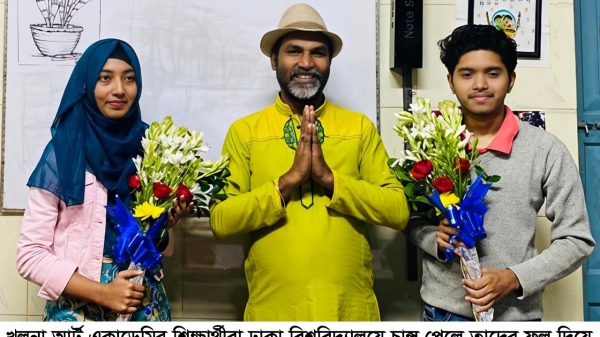 খুলনা আর্ট একাডেমির শিক্ষার্থীদের সাফল্যে চিত্রশিল্পী মিলন বিশ্বাসের ফুলের শুভেচ্ছা