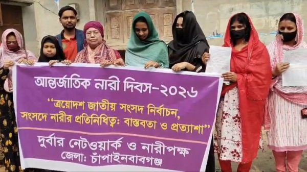 চাঁপাইনবাবগঞ্জে নারীদের নাগরিক মর্যাদা ও বৈষম্যহীনতার দাবিতে মানববন্ধন